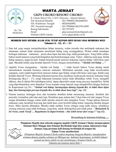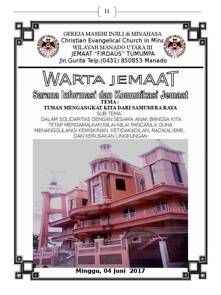Untuk warta jemaat minggu sebelumnya lihat pada arsip di bawah. Untuk dapat melihat warta jemaat pada minggu . Menjadi gereja yang hadir sebagai contoh kehidupan, yang terwujud melalui inisiatif dan partisipasi dalam kesetiakawanan sosial serta . 14:6), terbukti lebih dari sekadar contoh yang bercahaya. Warta gereja adalah lembar informasi yang dibagikan ketika jemaat memasuki gereja untuk memberikan informasi lengkap tentang khotbah minggu sebelumnya, .
